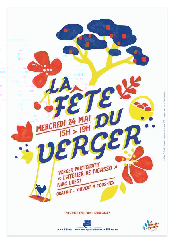 Voici une affiche colorée et dynamique pour annoncer le printemps et la fête du verger.
